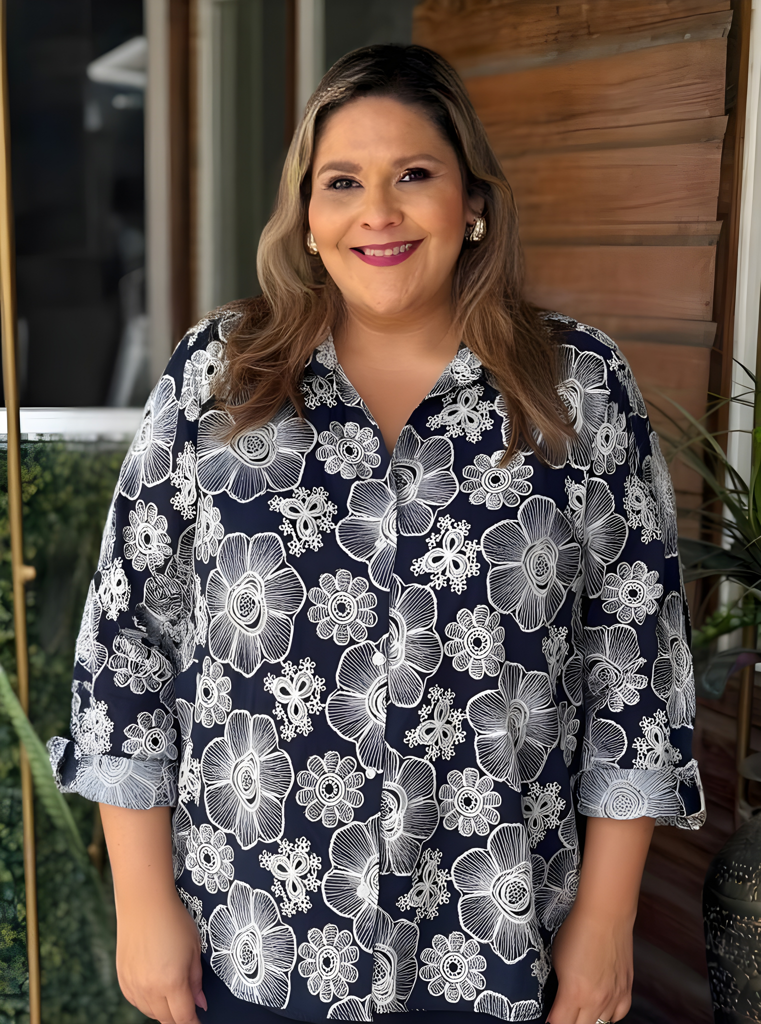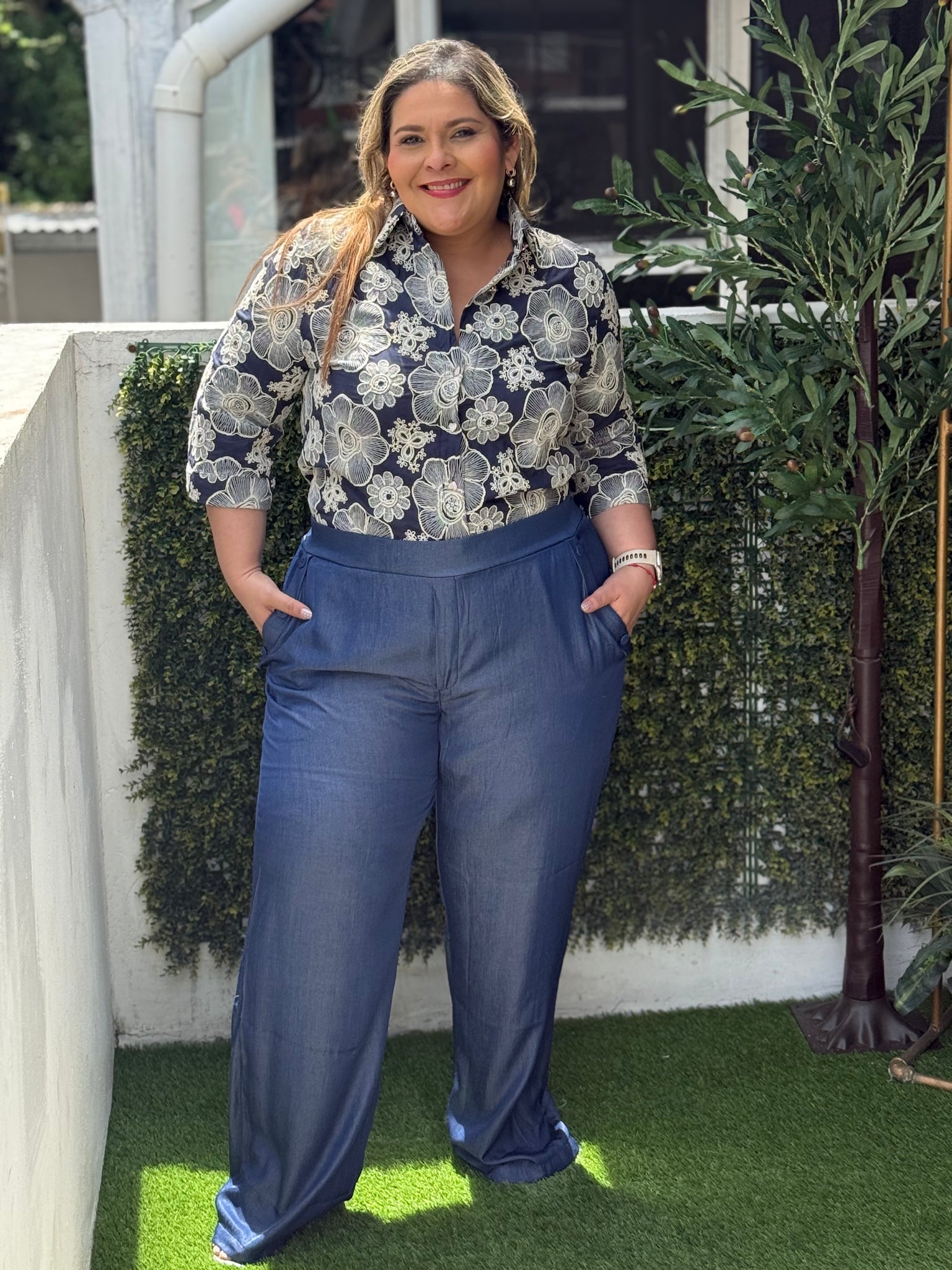 Blusa azul con bordado beige, cuello V, botones corazón con brillo, manga larga.