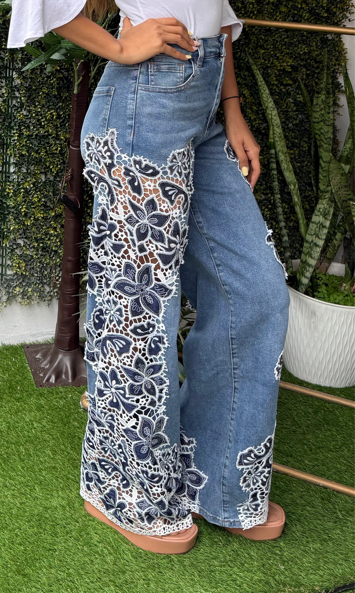 Pantalon denim azul con diseño de flores tejidas blanca con azul a los lados.
