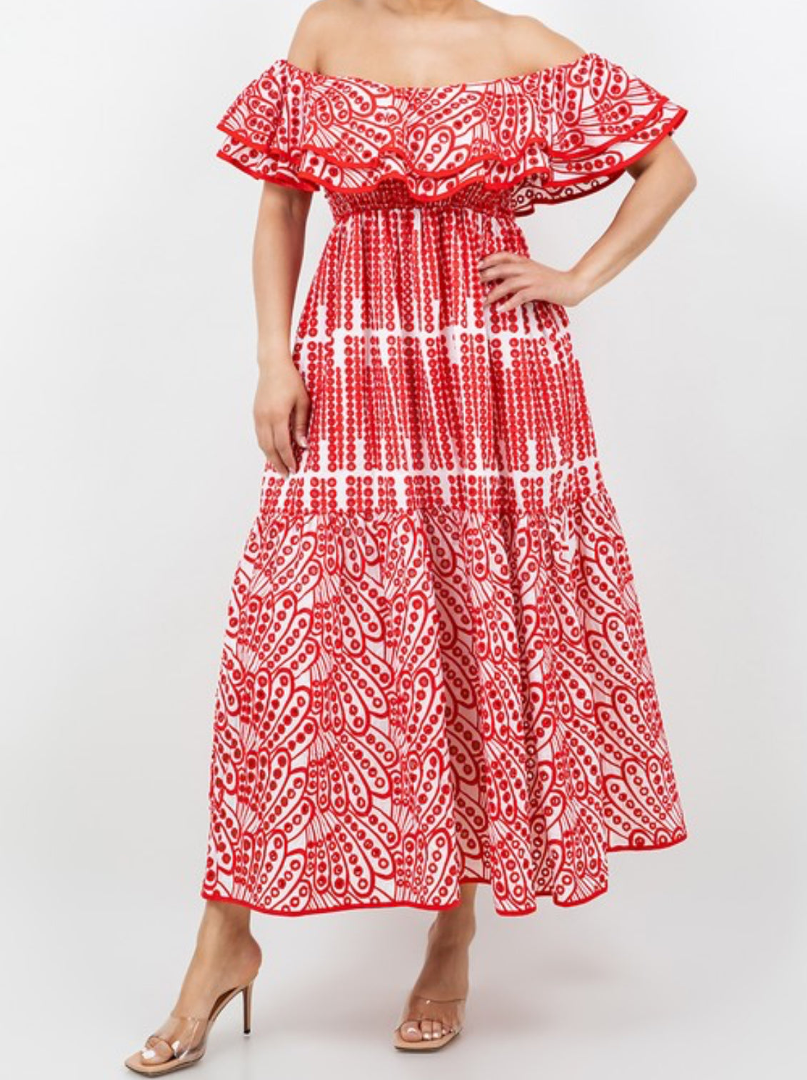 Vestido mide rojo de ojalillo con hombro descubierto, elástico en la parte del busto Y ruchas en los hombros.
