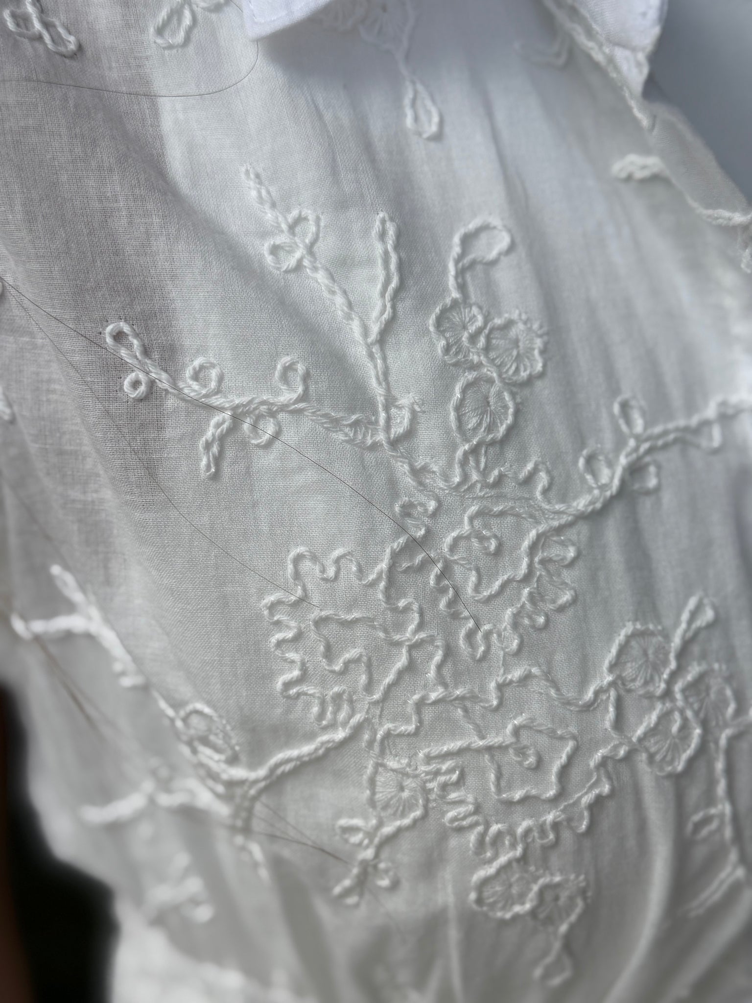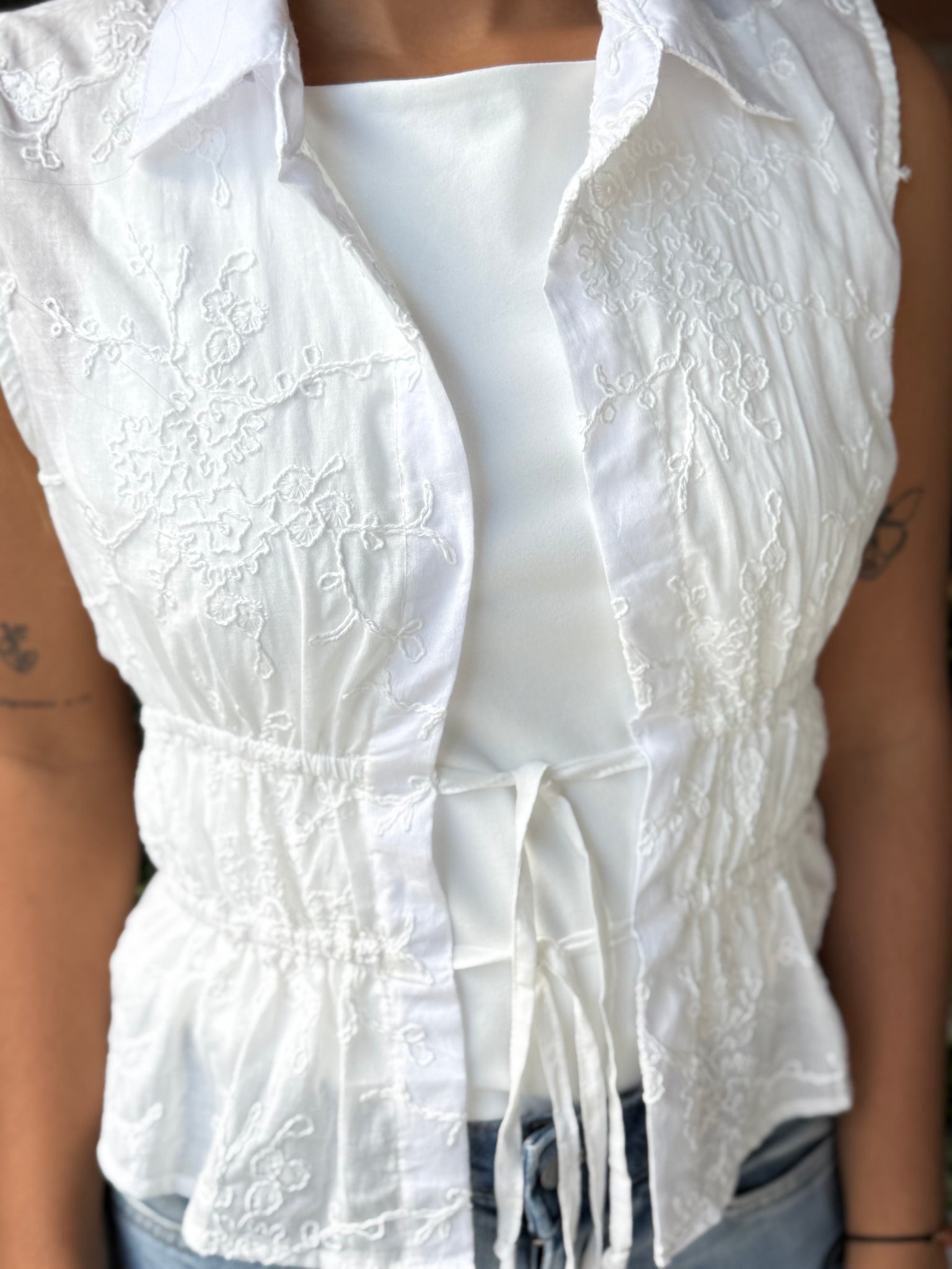 Vest blanco bordado con cuello V, lazos en frente y recogido en la cintura.