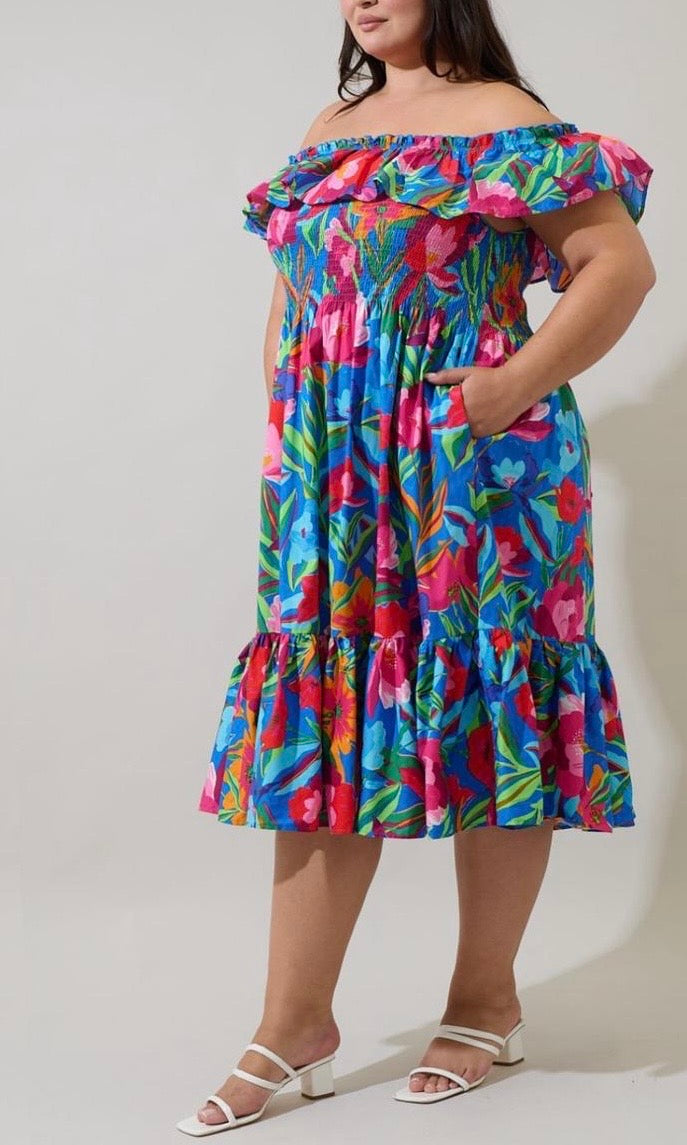 Vestido midi one shoulder, con rucha y elastico en la parte del busto y manga, con estampado floral.