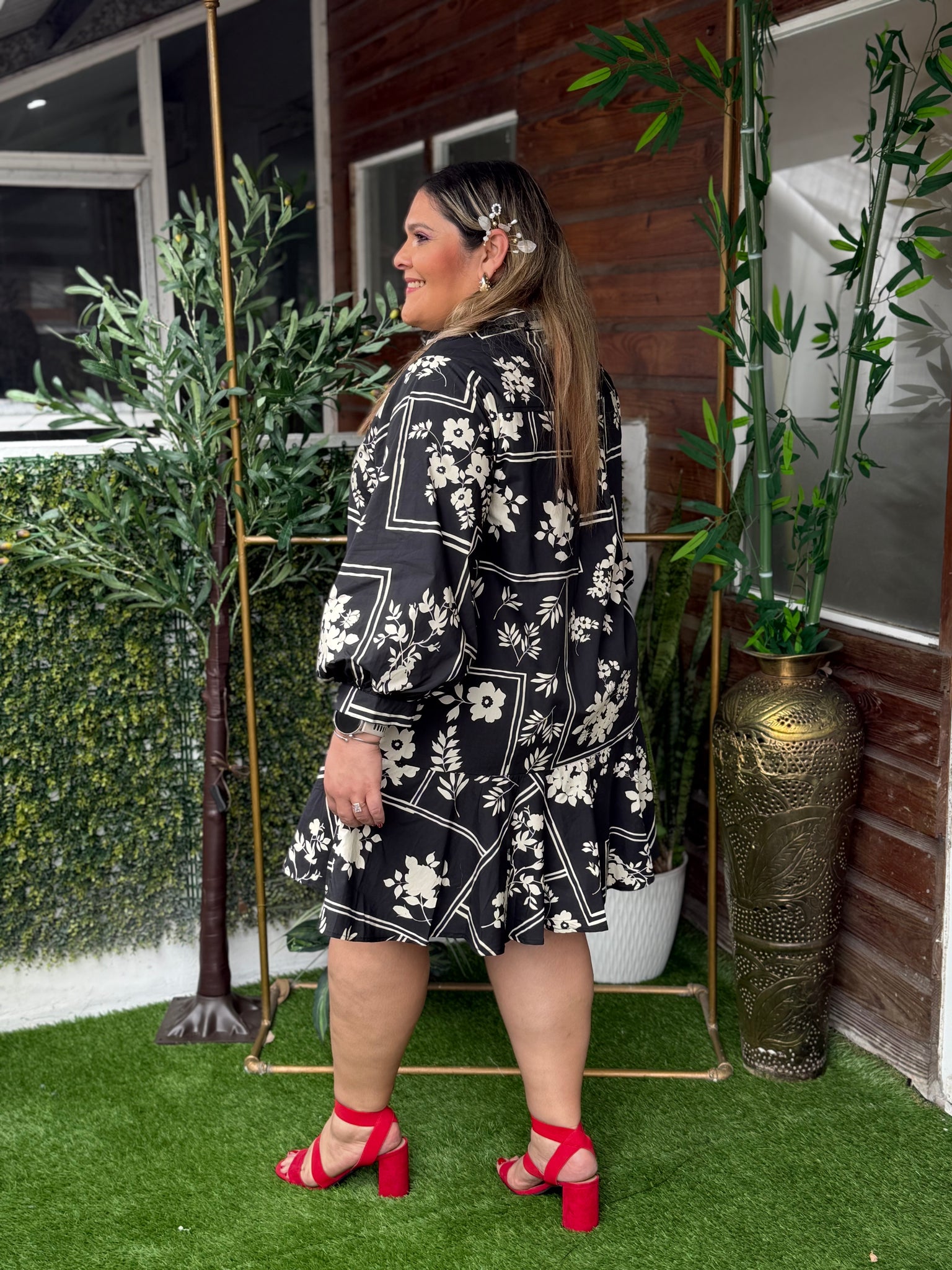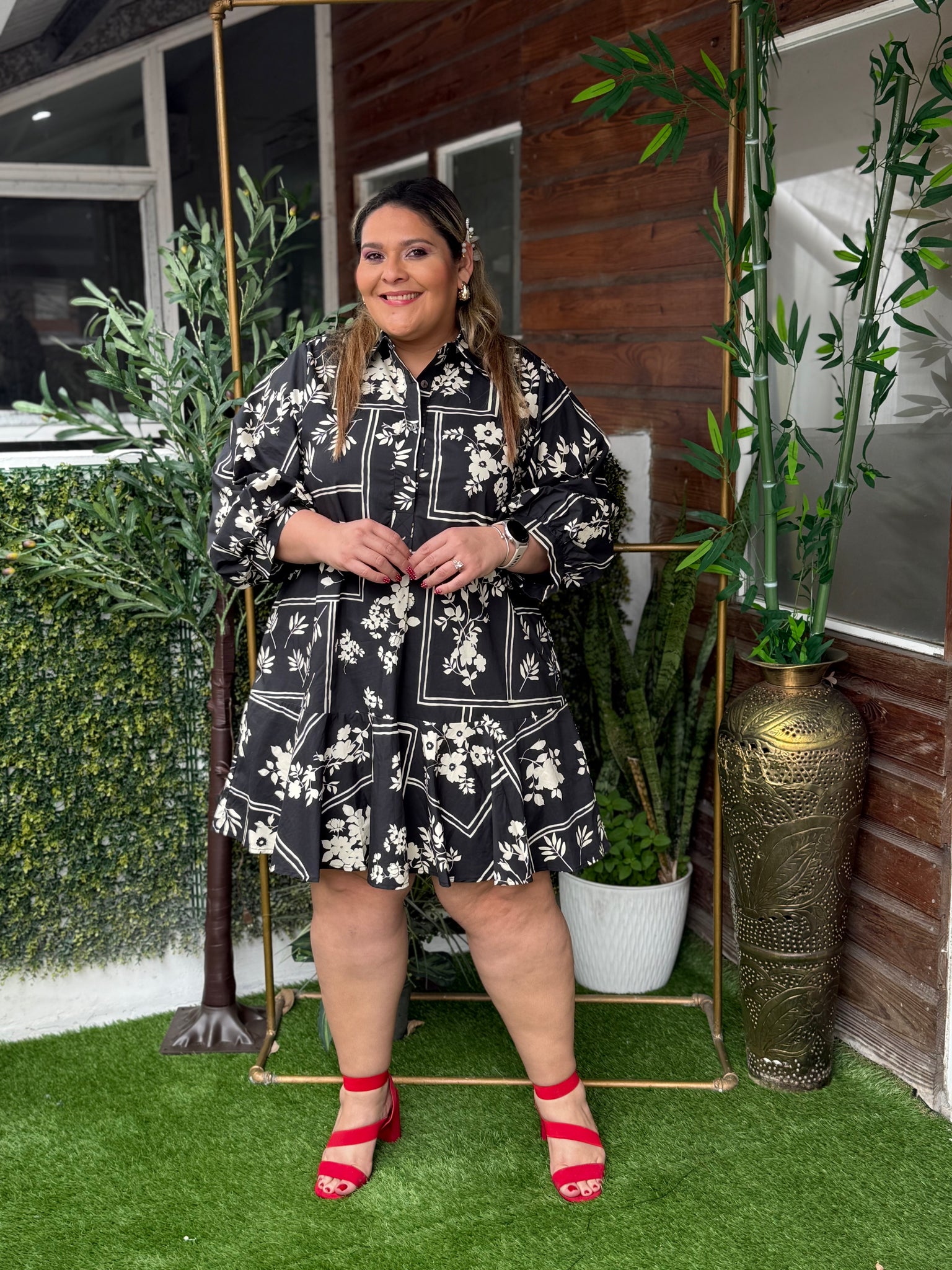 Vestido corto manga 3/4, cuello V con botones. Color negro con estampado beige.