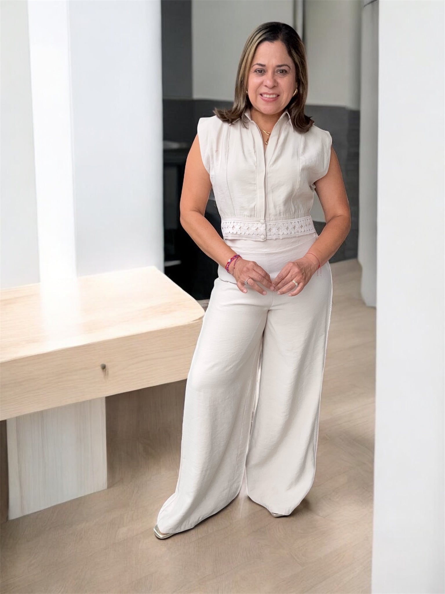 Set pantalon con elastico en la parte de atras, zipper al lado con bordado a los lados, Blusa manga sisa, cuello V con diseño en la cintura.