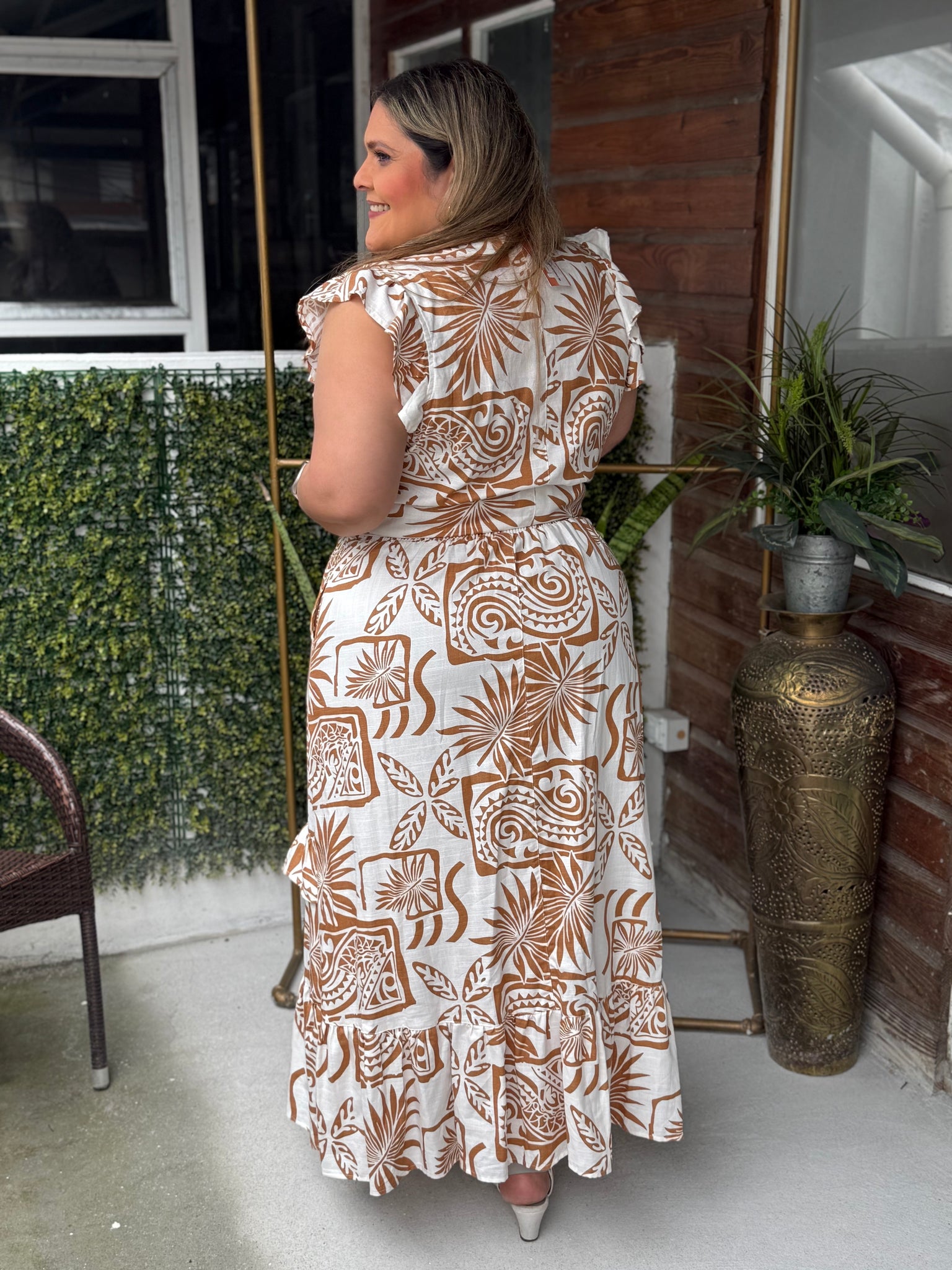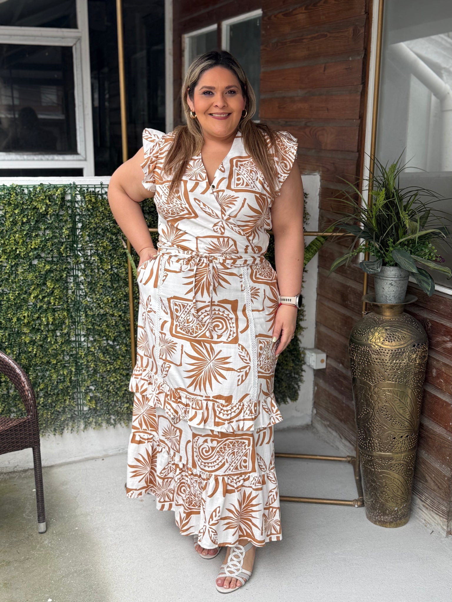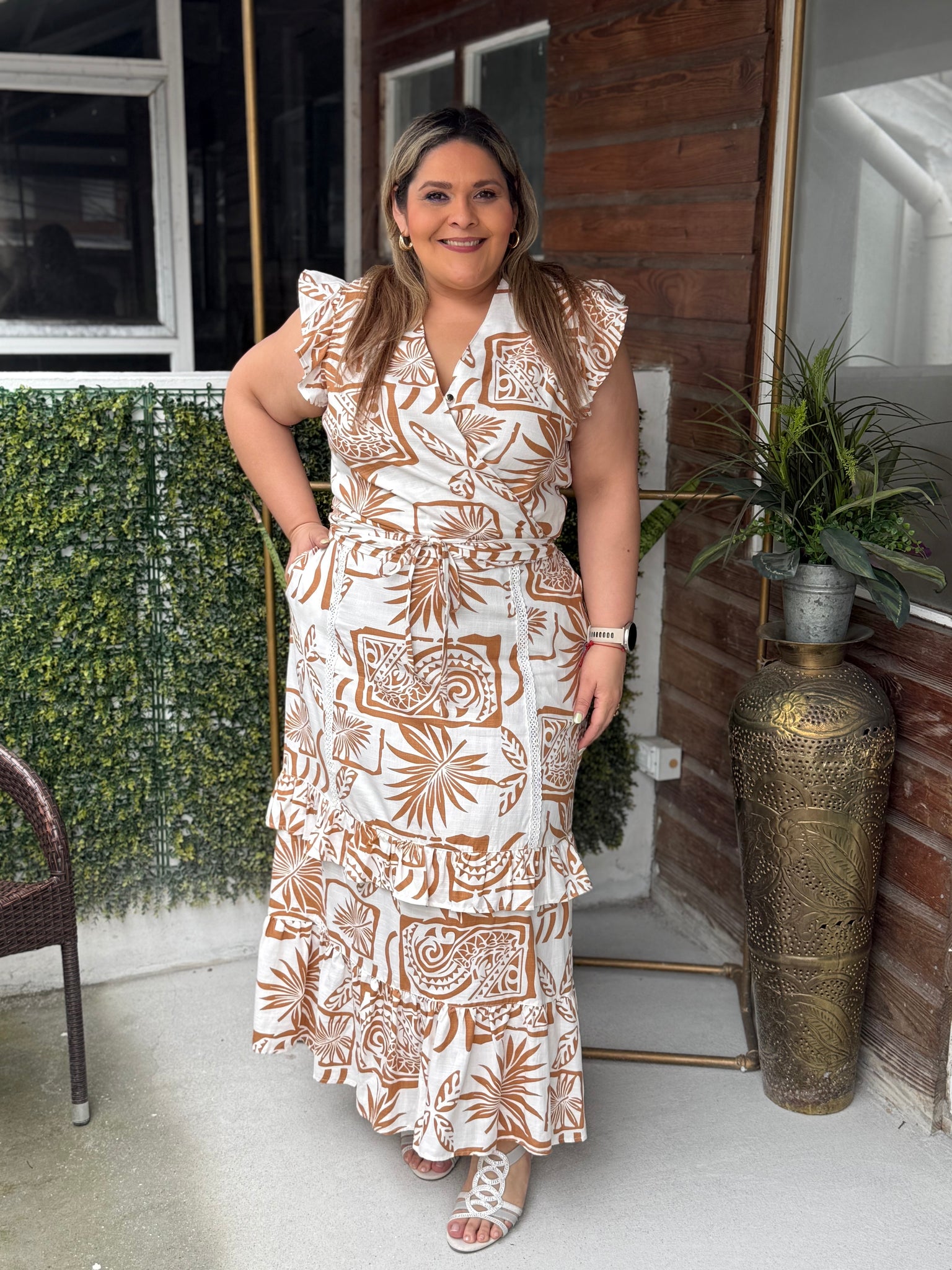 Set falda con elastico en la parte de atras de la cintura, encaje en la parte de al frente y ruchas en la parte de abajo, blusa cruzada con tiras, cuello en V, con boton y ruchas en las mangas. color blanco con estampado cafe.