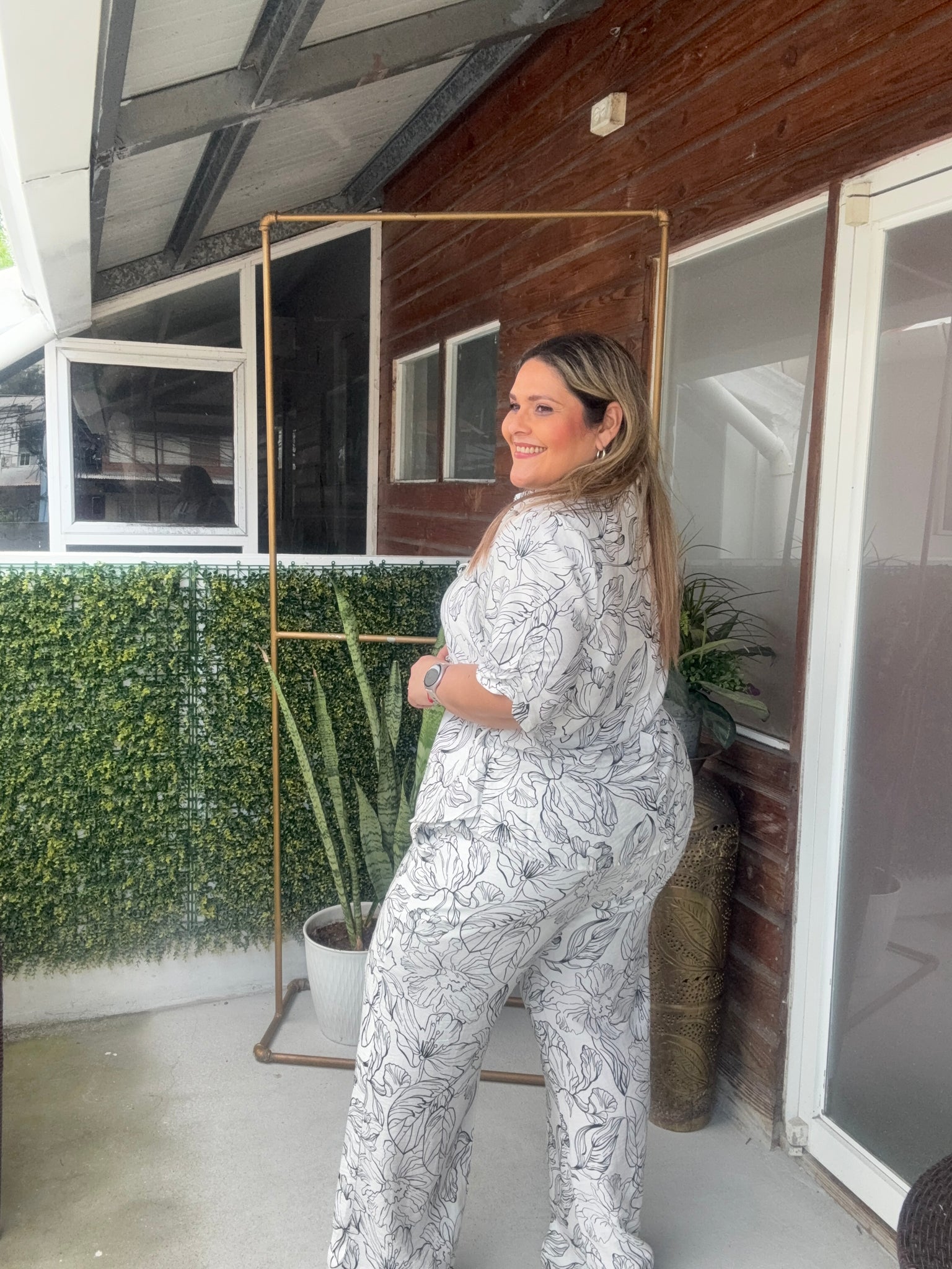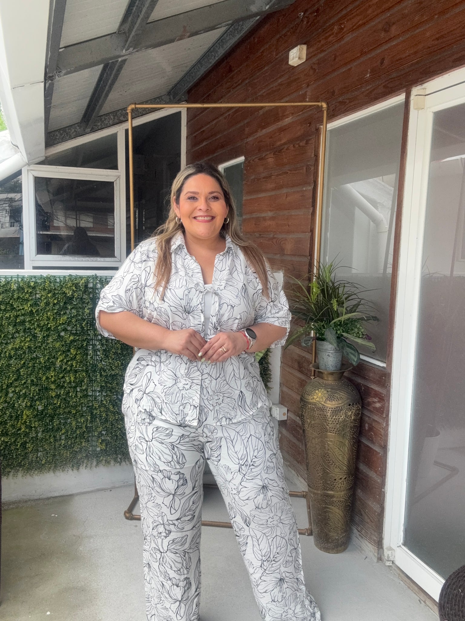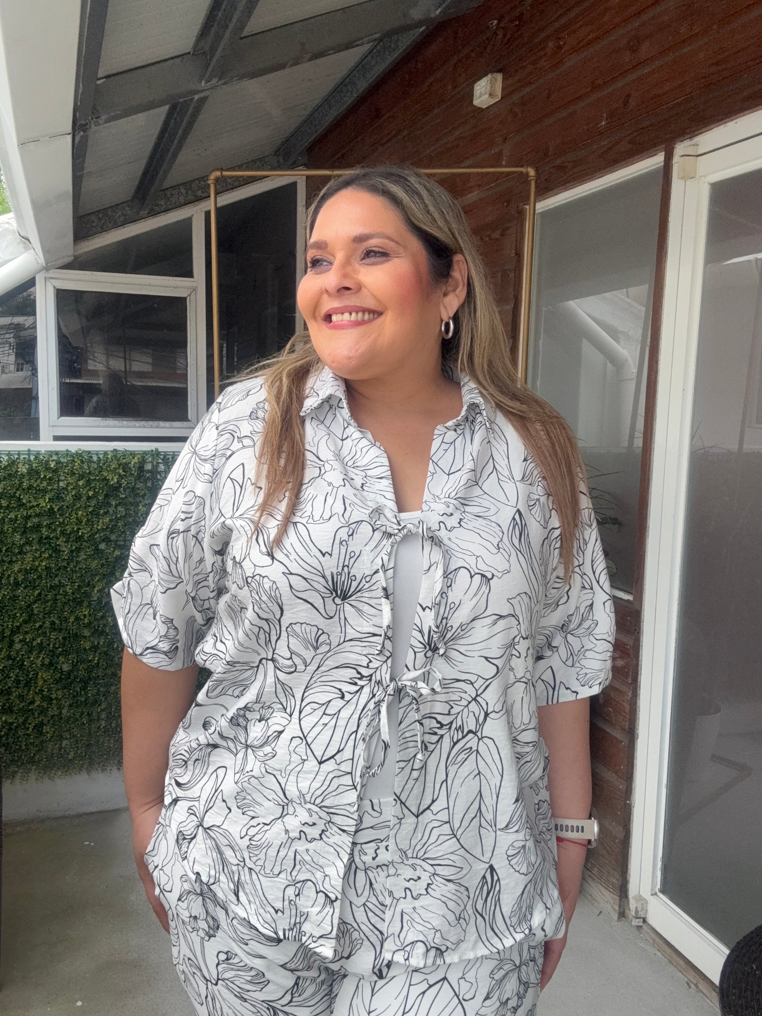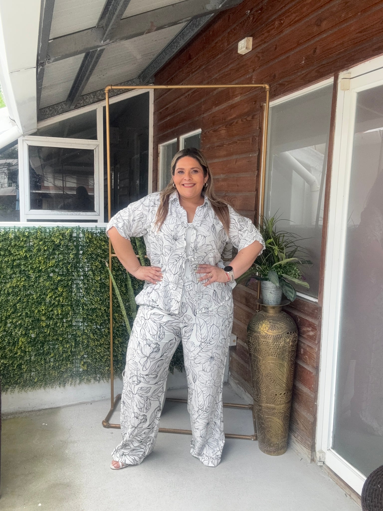 Set blusa cuello V, manga corta con lazo en la parte de al frente, pantalón con elastico en la parte de atras de la cintura, estampado floral negro.