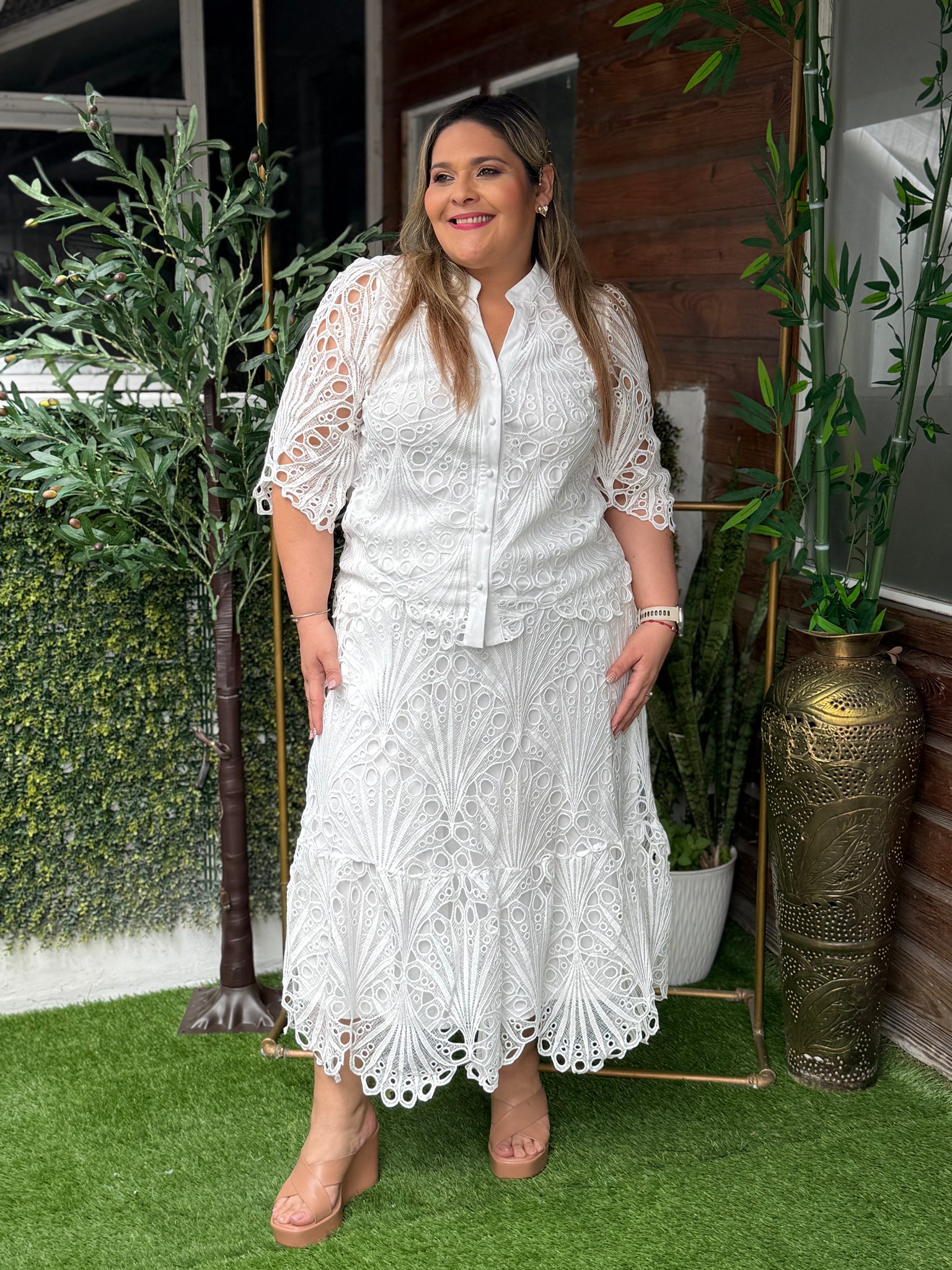 Set de ojalillo, falda con elastico en la parte de atras mas blusa cuello V, con botones.