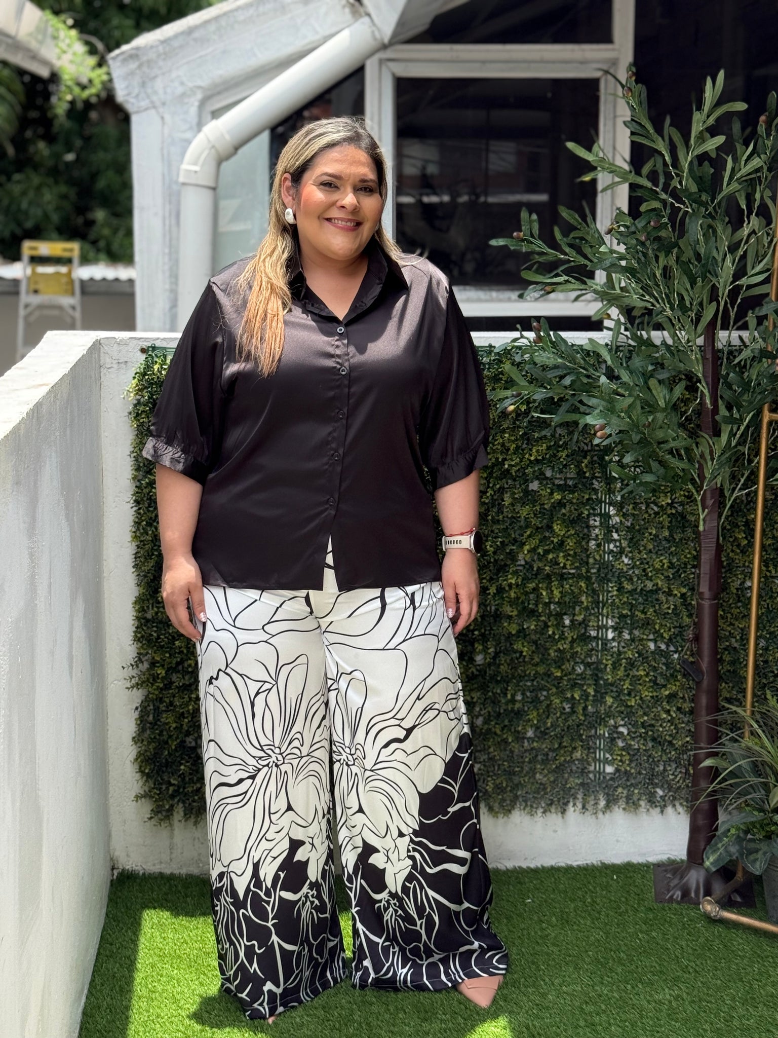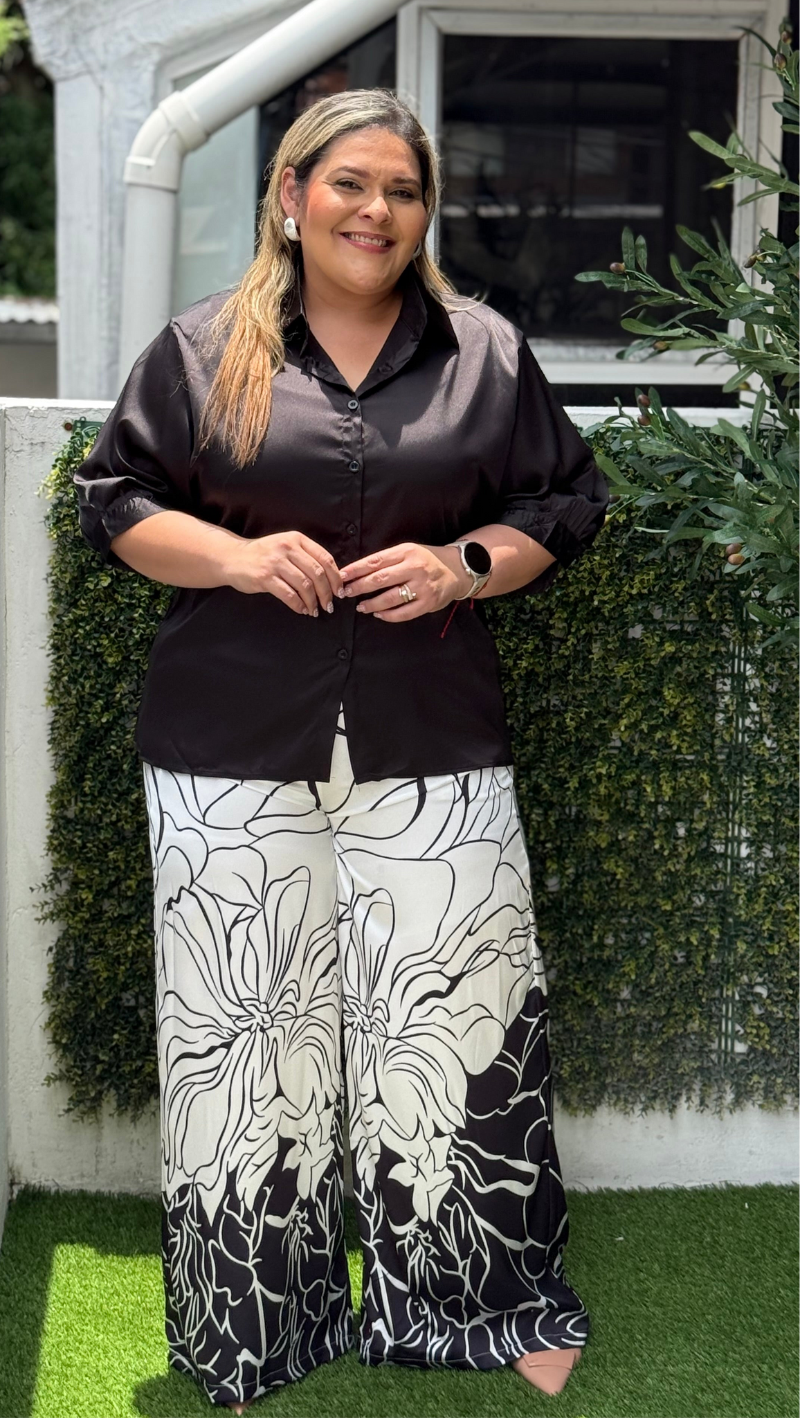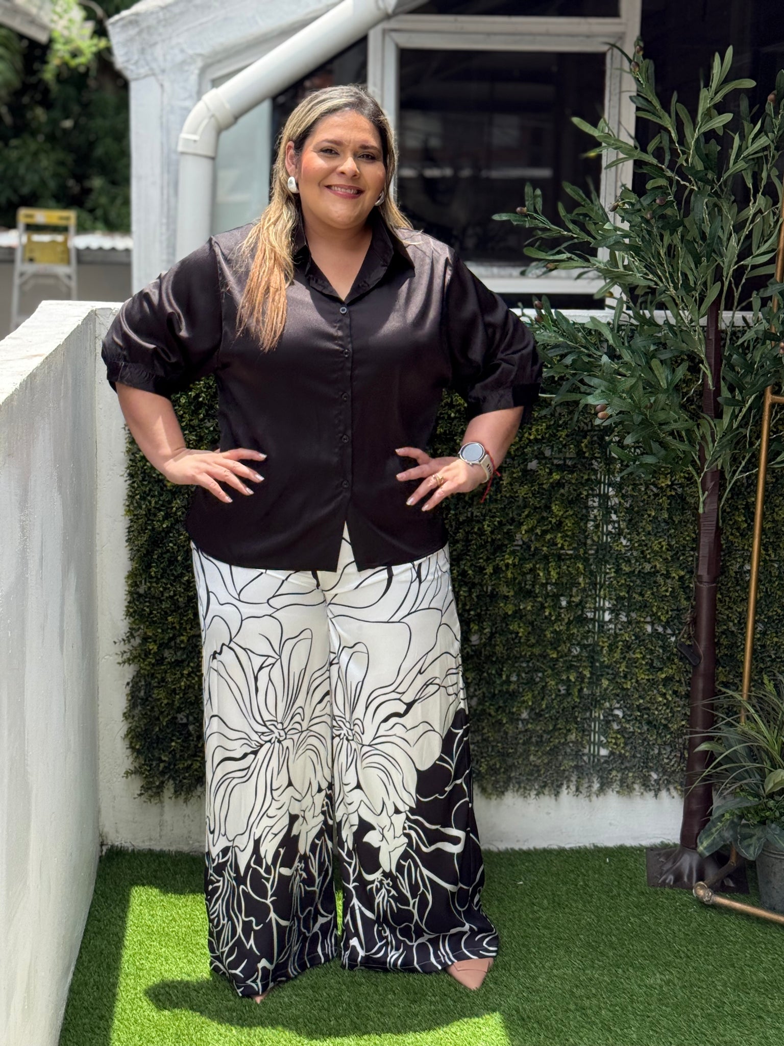 Set pantalon blanco con estampado negro, con elastico en la cintura mas blusa negra con cuello V, mangas 3/4, satinado.