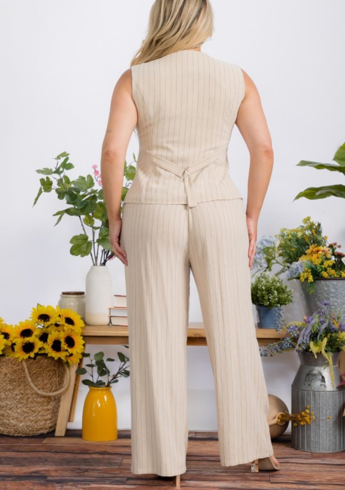 Set pantalon beige con lineas negras con elastico en la cintura, mas vest beige con lineas negras con boton y cinturon para ajustar en la parte de atras.